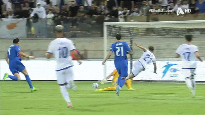 Η άμυνα της Εθνικής ήταν ψηλά και τα κενά στη μεσοαμυντική γραμμή μεγάλα, με τον Κάστανο να πετά κάθετα για τον Τζιωνή που έφυγε στην πλάτη του Μαυροπάνου και πλάσαρε τον Βλαχοδήμο για το 1-0.