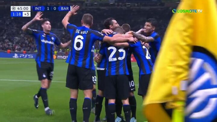 Η Ίντερ άνοιξε το σκορ στην αναμέτρηση με την Μπαρτσελόνα. Σκόρερ για την ιταλική ομάδα ήταν ο Τσαλχάνογλου, ο οποίος έπιασε ένα φοβερό σουτ έξω από την περιοχή και έστειλε την μπάλα στα δίχτυα του Τερ Στέγκεν.
