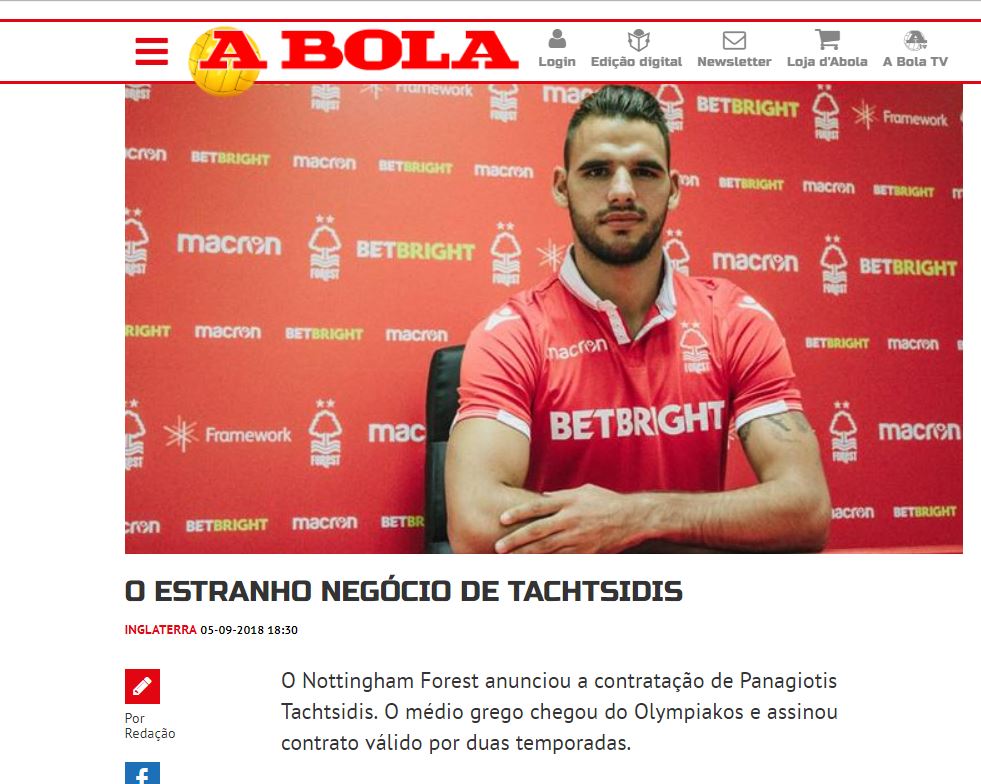 Αν και ο Παναγιώτης Ταχτσίδης αποτελεί παρελθόν για τον Ολυμπιακό, εντούτοις η υπόθεσή του δεν έχει τελειώσει σύμφωνα με την πορτογαλική εφημερίδα «A BOLA», στην οποία βλέπουν… φαντάσματα για τη μετακίνηση στη Νότιγχαμ Φόρεστ.