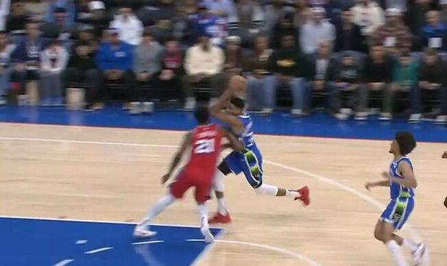 Ο Έλληνας σούπερ σταρ έφυγε στον αιφνιδιασμό και ο Αμερικανός απλώνει με δύναμη το χέρι του στα πλευρά του παίκτη του Μιλγουόκι ο οποίος για λίγα λεπτά έμεινε κάτω έπειτα από τον οξύ πόνο που αισθάνθηκε.