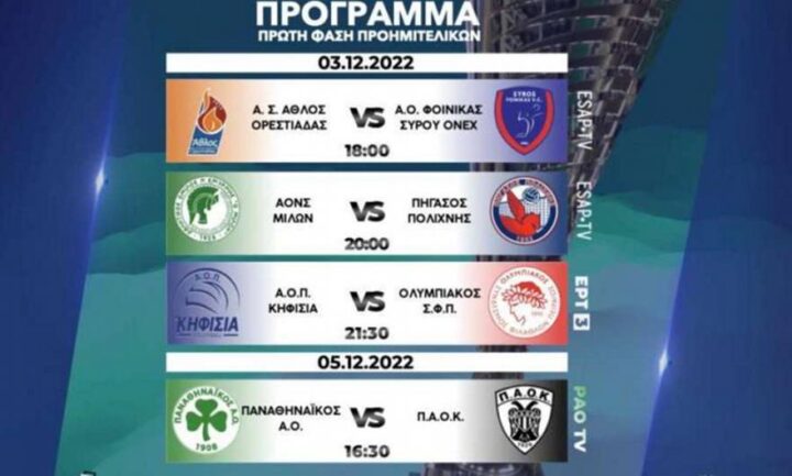 Γυμναστήριο «Μ. Μερκούρη», 19.30 (Live Streaming ESAP): Ολυμπιακός Σ.Φ.Π. – Α.Ο.Π. Κηφισιάς Διαιτητές: Κουτσούλας, Νικάκης, Παρατηρητής: Πολίτης, ΕΠόπτες: Κατσιάρας, Σαμοθράκης, Γραμματεία: Καρατζογλίδου.
