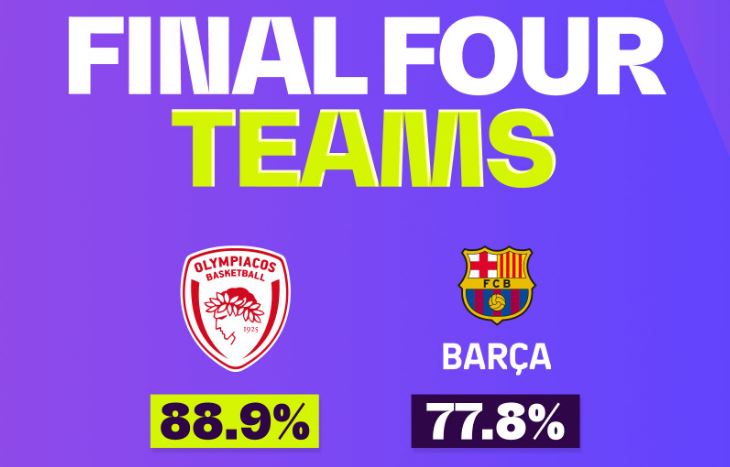 Ο Ολυμπιακός μάλιστα είναι το φαβορί για παρουσία στο Final Four με ποσοστό 88,9% (!!) μπροστά από Μπαρτσελόνα (77,8%), Φενέρμπαχτσε (72.2%) και την πρωταθλήτρια Ευρώπης, Αναντολού Εφές (61,1%).