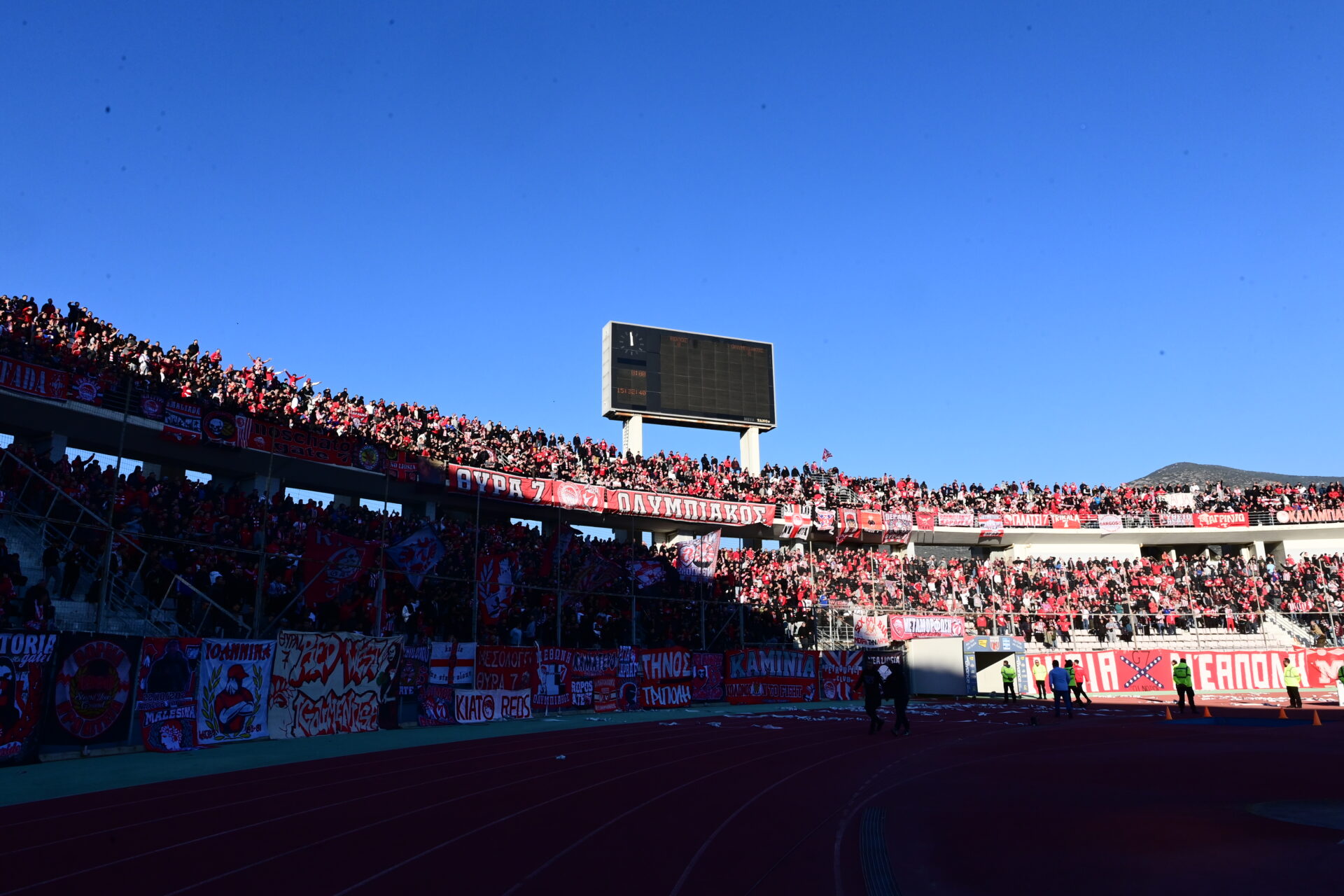 Γεμάτη η κεντρική θύρα του σταδίου από τους οπαδούς των πρωταθλητών Ελλάδας, όπως και το ένα πέταλο, με τον ΝΠΣ Βόλο να διαψεύδεται που έκανε λόγο για εισιτήρια που αντιστοιχούσαν ούτε σε 10.000 φιλάθλους των Πειραιωτών. Στις κερκίδες βρίσκονται ήδη κοντά στις 15!