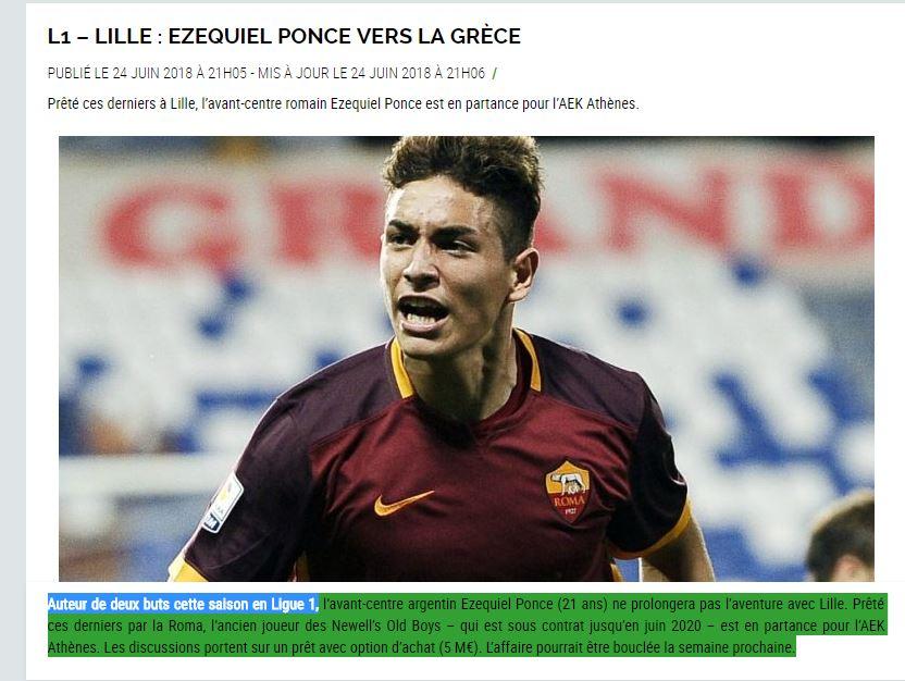 «Ο σέντερ φορ Εζεκιέλ Πόνσε δεν θα δώσει συνέχεια στην περιπέτειά του με τη Λιλ. Ο παίκτης που δόθηκε δανεικός από τη Ρόμα -πρώην της Νιούελς Ολντ Μπόις- που έχει συμβόλαιο έως το 2020, θα φύγει για την ΑΕΚ της Αθήνας. Οι συζητήσεις αφορούν δανεισμό με οψιόν αγοράς (5 εκατ. ευρώ). Η υπόθεση αναμένεται να κλείσει την επόμενη εβδομάδα», αναφέρει χαρακτηριστικά το εν λόγω δημοσίευμα για τον 21χρονο Αργεντίνο επιθετικό.