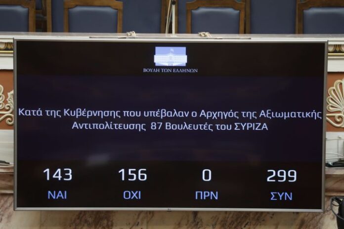 Απορρίφθηκε με 156 «όχι» και 143 «ναι» η πρόταση δυσπιστίας που υπέβαλλε εναντίον της κυβέρνησης, ο αρχηγός της αξιωματικής αντιπολίτευσης και η ΚΟ του ΣΥΡΙΖΑ.
