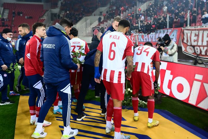 Τη μνήμη των θυμάτων της Θύρας 7 τίμησαν οι ποδοσφαιριστές του Ολυμπιακού και του Παναιτωλικού, αφήνοντας λουλούδια μπροστά στη Θύρα των οργανωμένων οπαδών των Ερυθρόλευκων.