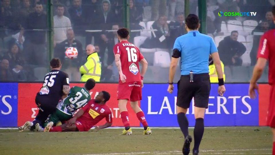Οι Πράσινοι αναφέρονται στη φάση του 40ού λεπτού όπου ο Παλάσιος έπεσε κάτω στη σύγκρουση με τον Σι – ο Μαντσίνι είναι αυτός που σεντράρει στην περιοχή – με τον Φωτιά (πρώτος) και τον Σιδηρόπουλο (VAR) να κρίνουν πως δεν υπάρχει κάτι.