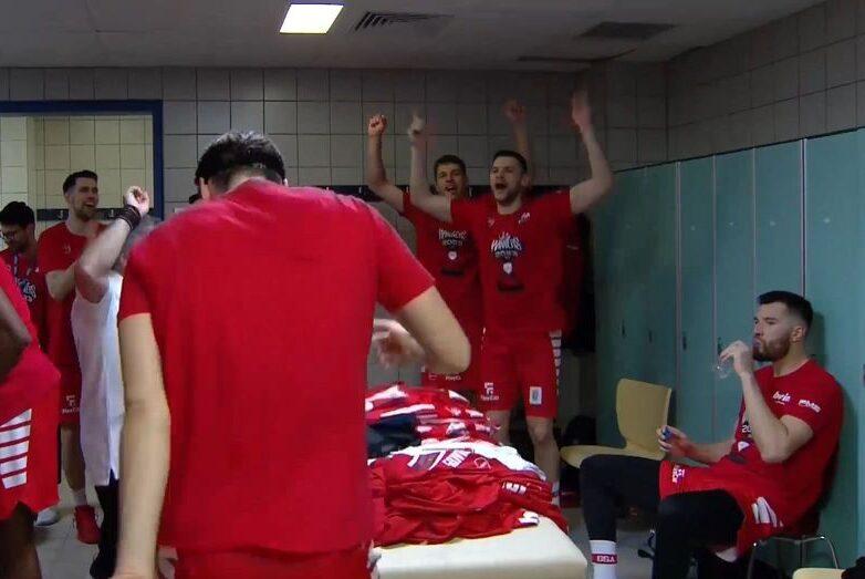 Οι παίκτες του Γιώργου Μπαρτζώκα έσπευσαν στα αποδυτήρια μετά τη λήξη της αναμέτρησης για να φορέσουν τα μπλουζάκια τους για την απονομή και παράλληλα όλοι ξεκίνησαν να φωνάζουν συνθήματα και να αφιερώνουν το τρόπαιο στον γυμναστή Ανδρέα Γκατζούλη και τον αθλητικό διευθυντή Χρήστο Μπαφέ, που πέρασαν μια περιπέτεια με την υγεία τους αλλά πλέον είναι καλά.