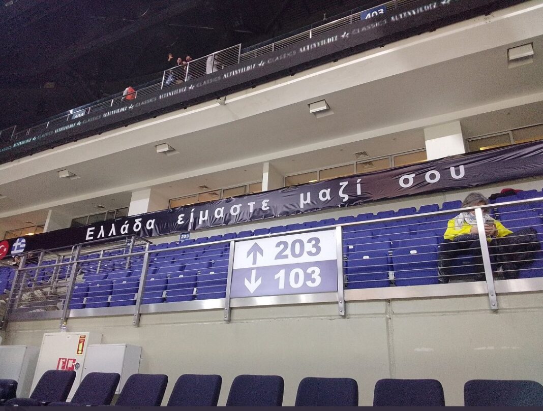 Αυτό που ξεχωρίζει στην Ulker Sports Arena είναι ένα πανό γραμμένο στα ελληνικά από τους φίλους της τουρκικής ομάδας, οι οποίοι στέλνουν έτσι το δικό τους μήνυμα στήριξης στη χώρα μας την ώρα που και αυτοί θρηνούν δικού τους ανθρώπους μετά τον φονικό σεισμό που έπληξε την Τουρκία.