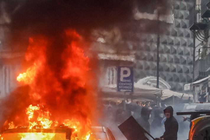 Τραυματισμοί μπορεί να μην υπήρχαν, αλλά η Νάπολη θύμιζε βοβαρδισμένο τοπίο, με κοτρόνες να βρίσκονται στους δρόμους και το… χειρότερο, πολλά αυτοκίνητα να μη γλυτώνουν και να τυλίγονται στις φλόγες.