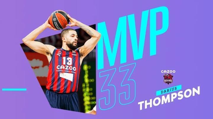 O Ντάριους Τόμπσον της Μπασκόνια αναδείχτηκε πολυτιμότερος παίκτης της 33ης και προτελευταίας αγωνιστικής της Euroleague. O 27χρονος γκαρντ σημείωσε το έκτο double double του την τρέχουσα αγωνιστική σεζόν, οδηγώντας την ομάδα της Βιτόρια στη νίκη με 120-100 επί της Βιλερμπάν.