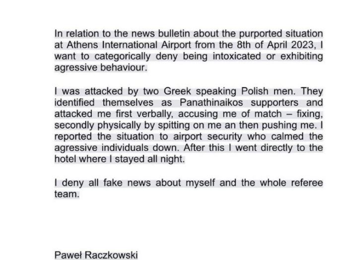 Ο Πάβελ Ρατσκόφσκι, διαιτητής που ορίστηκε αρχικά στο ΑΕΚ – Άρης και αντικαταστάθηκε με απόφαση της ΚΕΔ με προσωπική του δήλωση στα πολωνικά Μέσα έσπευσε να διαψεύσει τα όσα γράφτηκαν για εκείνον και τη διαιτητική του ομάδα.