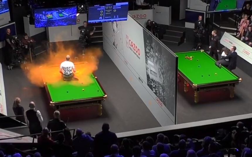 Κατά τη διάρκεια αγώνων στο κυρίως ταμπλό του Crucible για το Παγκόσμιο Πρωτάθλημα 2023, διαδηλωτής πρόλαβε να ανέβει πάνω στην τσόχα με μπλουζάκι που είχε το μήνυμα «Just Stop Oil», ενώ έριξε και πορτοκαλί σκόνη προκαλώντας προσωρινή διακοπή.
