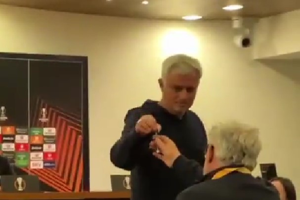 Σε τρελά κέφια ο Μουρίνιο μετά την πρόκριση: Έδωσε μπρελόκ με το τρόπαιο του Conference League σε Ολλανδό δημοσιογράφο (vid)