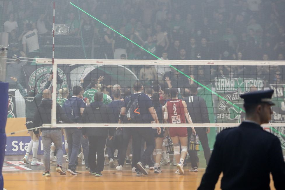 Κατά τη διάρκεια του πρώτου τελικού στις Γυναίκες ανάμεσα σε Παναθηναϊκό και Ολυμπιακό – για την ακρίβεια στο τρίτο σετ – άναψε καπνογόνο και προκάλεσε αποπνικτική ατμόσφαιρα. Το παιχνίδι διακόπηκε για λίγο αλλά στη συνέχεια (κι αφού έγινε το 2-1) ο διαιτητής Μυλωνάκης διέταξε εκκένωση ως τις 23:45 προκειμένου να συνεχιστεί η αναμέτρηση.