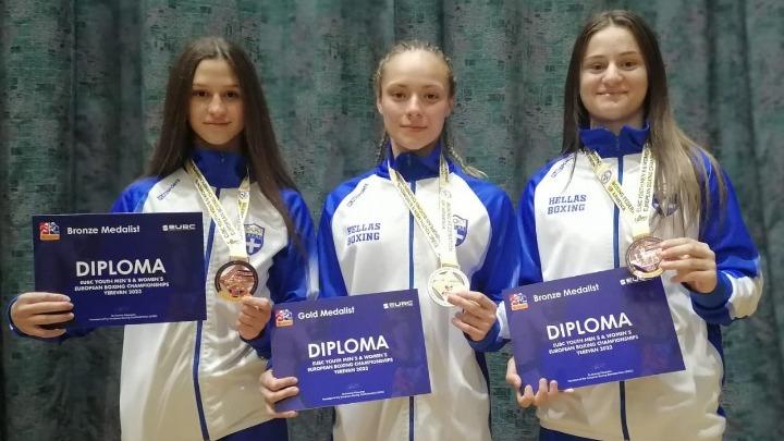 Με τρία μετάλλια… γένους θηλυκού επιστρέφει η ελληνική αποστολή από το Ευρωπαϊκό Πρωτάθλημα πυγμαχίας νέων/νεανίδων που ολοκληρώθηκε στο Γερεβάν της Αρμενίας. Η εθνική ομάδα ολοκλήρωσε την παρουσία της με τον καλύτερο τρόπο κατακτώντας ένα χρυσό μετάλλιο και δύο χάλκινα δείχνοντας ακόμη μία φορά ότι τα «γαλανόλευκα γάντια» αφήνουν… τη σφραγίδα τους από όπου κι αν περάσουν.