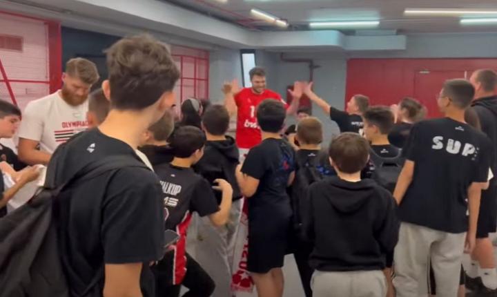 Ωστόσο αυτό που έχει αξία από την παρακάμερα των Ερυθρολεύκων είναι αυτό που δεν φάνηκε στην τηλεόραση και δεν είναι άλλο από το πολύ όμορφο τελετουργικό που έκαναν οι Πειραιώτες όπως κάνουν κάθε φορά, ωστόσο αυτή τη φορά με την βοήθεια και των παιδιών της Elite Basketball, όπως είχε προϊδεάσει ο Ολυμπιακός.