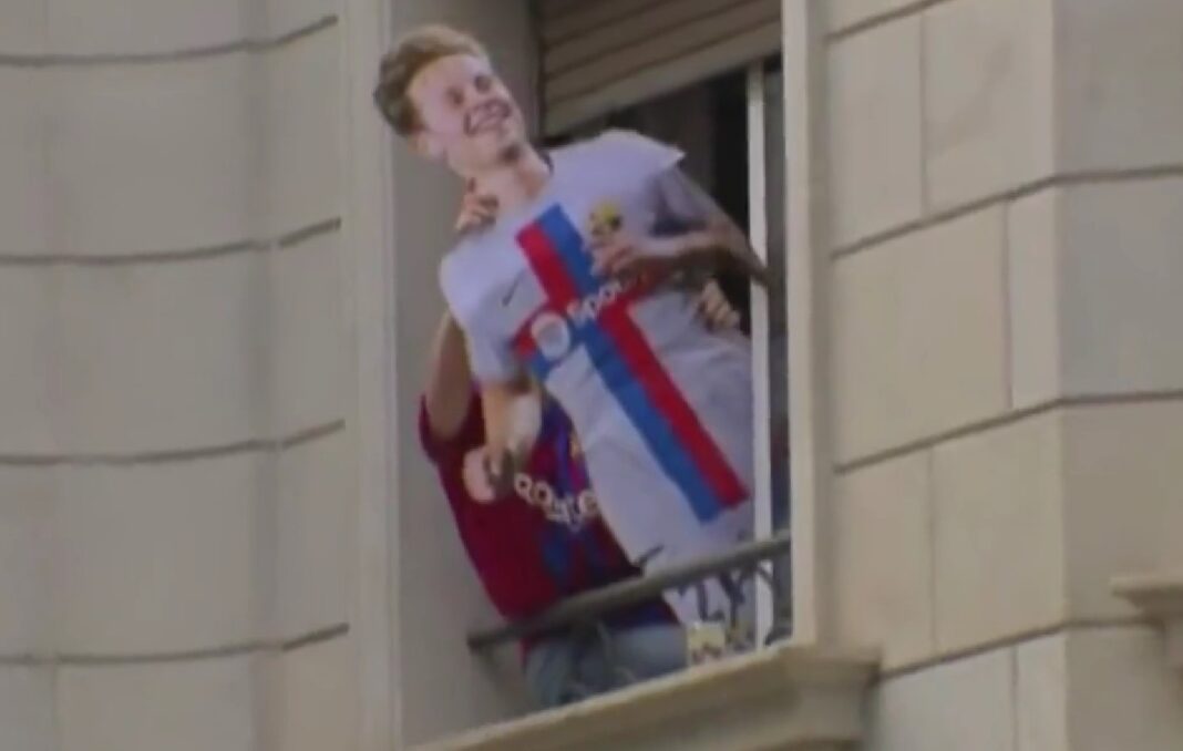 Συγκεκριμένα, φίλος της Μπαρτσελόνα βγήκε στο παράθυρο του κρατώντας ομοίωμα του Ντε Γιονγκ και όπως είναι λογικό τράβηξε αμέσως όλα τα βλέμματα πάνω του.