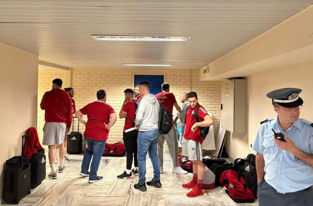 Η ομάδα του Νίκου Γραμματικού έφτασε στην ώρα της αλλά έπρεπε να περιμένει περίπου μισή ώρα ώστε να βρουν οι άνθρωπο της ΑΕΚ τα κλειδιά για να ανοίξουν την πόρτα των αποδυτηρίων του Ολυμπιακού.
