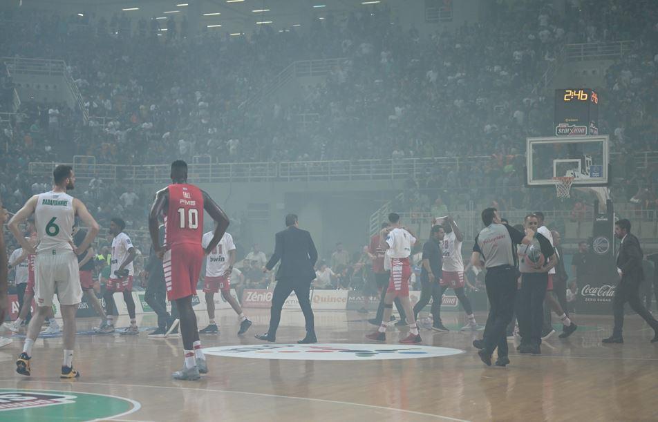 Υπενθυμίζεται πως στα 2:46 πριν την ολοκλήρωση της τρίτης περιόδου και με τη διαφορά στο +28 (35-63) για τον Ολυμπιακό στο ΟΑΚΑ, οπαδοί του Παναθηναϊκού άρχισαν να πετούν πολλά καπνογόνα που δημιούργησαν αποπνικτική ατμόσφαιρα αλλά και αντικείμενα στον ερυθρόλευκο πάγκο που πέρασαν μέσα από το δίχτυ προστασίας!