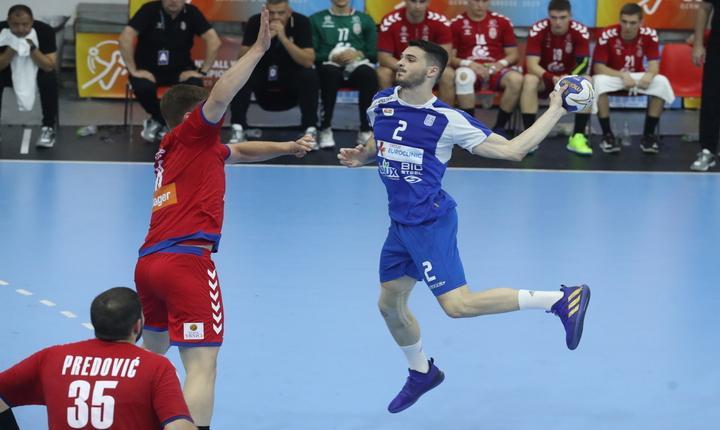 Μετά την ήττα της Αιγύπτου από την Ισλανδία, η ελληνική ομάδα χρειαζόταν νίκη με επτά γκολ διαφορά επί των «πλάβι» για να προκριθούν στους «8», ωστόσο και οι Σέρβοι χρειάζονταν τους δύο βαθμούς, προκειμένου να «κλειδώσουν» την παρουσία τους στα προημιτελικά. Η εθνική ξεκίνησε καλύτερα στο ματς και, βρίσκοντας λύσεις από τα εξτρέμ με Παπαγιάννη, Βασιλείου και Τζωρτζίνη, προηγήθηκε 6-4 στο 13΄, 8-6 στο 17΄ και 11-10 στο 23΄. Στη συνέχεια, ωστόσο, οι Σέρβοι πέτυχαν πέντε «αναπάντητα» γκολ και προσπέρασαν στο σκορ με 15-11, με τον Παπαγιάννη να διαμορφώνει το 15-12 που ήταν το σκορ με το οποίο έληξε το α΄ μέρος.