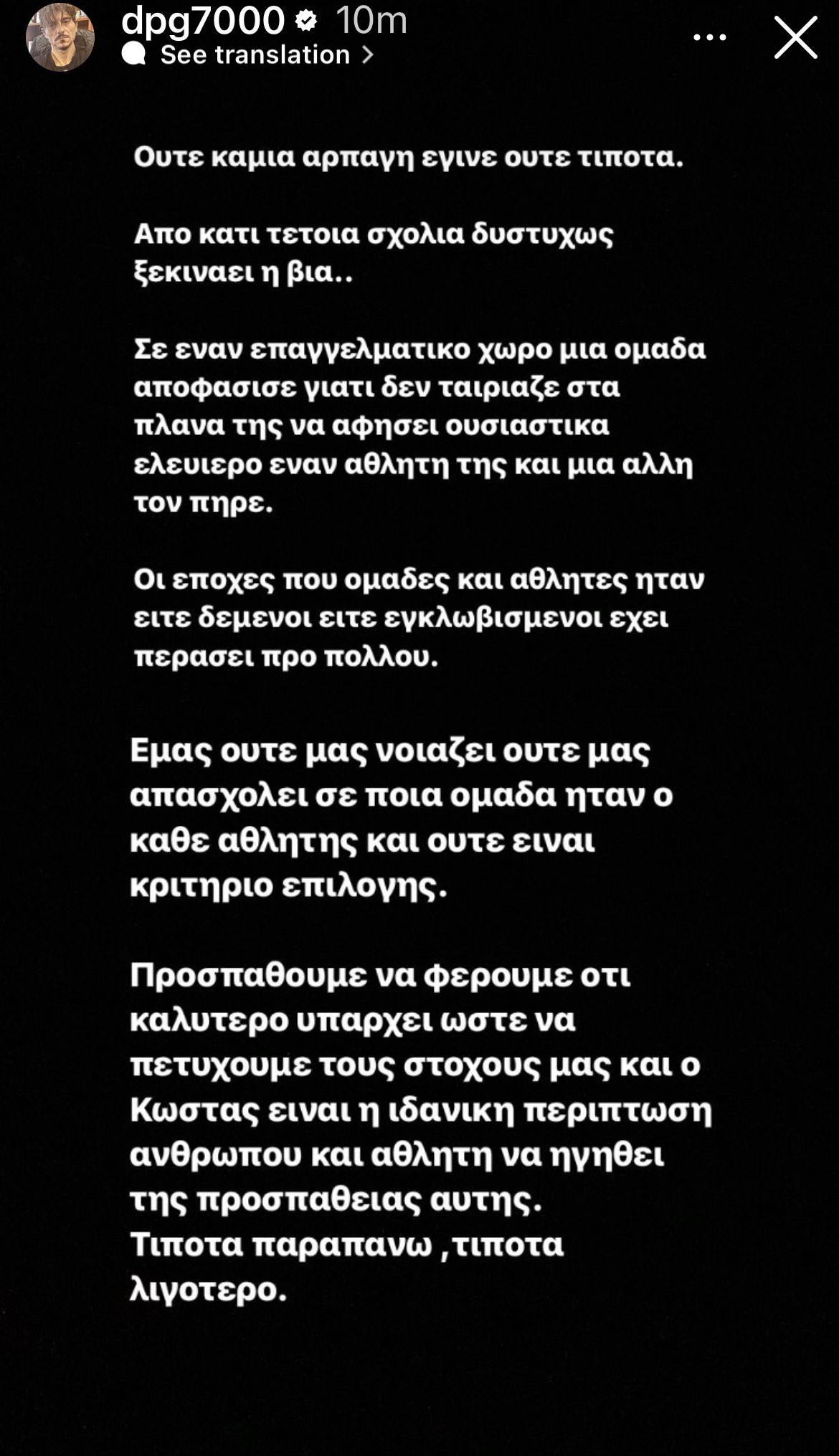 «Ούτε καμία αρπαγή έγινε ούτε τίποτα. Από κάτι τέτοια σχόλια δυστυχώς ξεκινάει η βία. Σε έναν επαγγελματικό χώρο μια ομάδα αποφάσισε γιατί δεν ταίριαζε στα πλάνα της να αφήσει ουσιαστικά ελεύθερο έναν αθλητή της και μια άλλη τον πήρε. Οι εποχές που ομάδες και αθλητές ήταν είτε δεμένοι είτε εγκλωβισμένοι έχει περάσει προ πολλού. Εμάς ούτε μας νοιάζει ούτε μας απασχολεί σε ποια ομάδα ήταν ο κάθε αθλητής και ούτε είναι κριτήριο επιλογής. Προσπαθούμε να φέρουμε ό,τι καλύτερο υπάρχει ώστε να πετύχουμε τους στόχους μας και ο Κώστας είναι η ιδανική περίπτωση ανθρώπου και αθλητή να ηγηθεί της προσπάθειας αυτής. Τίποτα παραπάνω, τίποτα λιγότερο», υποστήριξε στο InstaStory που δημοσίευσε.