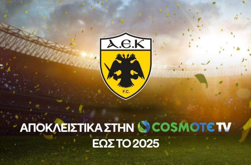 «Αποκλειστικά στην COSMOTETV θα «παίζει μπάλα» η ΠΑΕ ΑΕΚ έως το 2025. Οι δύο πλευρές ανανέωσαν τη συνεργασία τους για δύο ακόμη χρόνια και όλοι οι εντός έδρας αγώνες του «Δικεφάλου» για το Πρωτάθλημα της Stoiximan Super League, των ευρωπαϊκών προκριματικών, οι εντός και εκτός έδρας φιλικοί αγώνες, καθώς και επιλεγμένοι αγώνες των Πρωταθλημάτων Υποδομής (U19, K17), θα μεταδίδονται από τα κανάλια COSMOTESPORT.