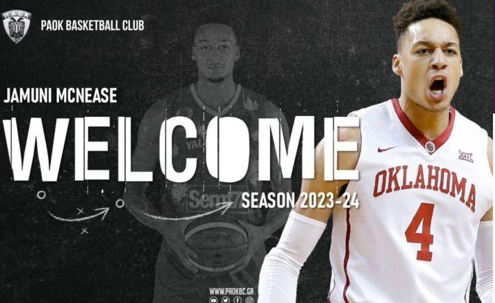 Η ΚΑΕ ΠΑΟΚ mateco ανακοινώνει τη συμφωνία με τον καλαθοσφαιριστή Jamuni McNease, ο οποίος θα αγωνιστεί στην ομάδα μας τη σεζόν 2023-24. Καλωσορίζουμε τον Jamuni McNease, έναν πολύ αθλητικό σέντερ στη μεγάλη οικογένεια του ΠΑΟΚ!