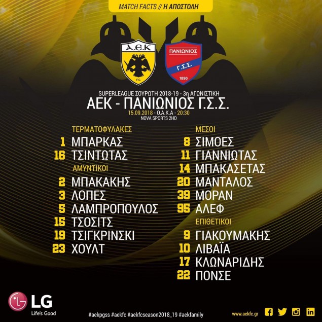 Αναλυτικά η αποστολή της ΑΕΚ: Μπάρκας, Τσιντώτας, Μπακάκης, Λόπες, Λαμπρόπουλος, Τσόσιτς, Τσιγκρίνσκι, Χουλτ, Σιμόες, Μοράν, Άλεφ, Μάνταλος, Γιαννιώτας, Κλωναρίδης, Μπακασέτας, Πόνσε, Γιακουμάκης, Λιβάγια.