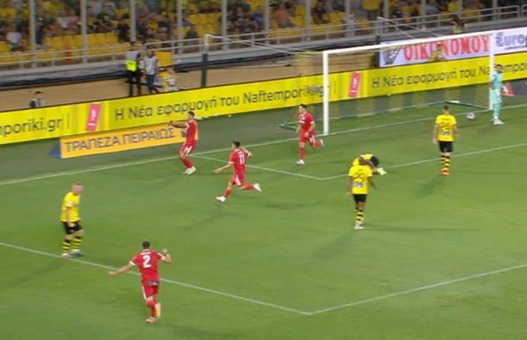 Ο Πηλέας έγινε κάτοχος της μπάλας από τα αριστερά και γέμισε στην περιοχή για τον Άλεξιτς που έπιασε την κεφαλιά και έκανε το 0-1.