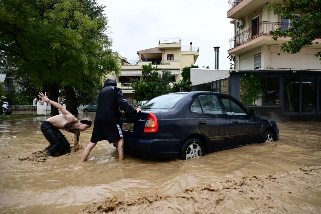 Σε τμήμα της συνοικίας του Αγίου Θωμά, στην πόλη της Λάρισας που γειτνιάζει με τον Πηνείο, τα νερά έχουν καλύψει πλέον δρόμους, αυλές σπιτιών, ενώ από αυτοκίνητα φαίνονται μόνο οι οροφές και κάτοικοι λένε ότι το νερό φτάνει – ίσως και να ξεπερνά – τα γόνατά τους.