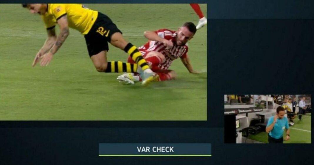 Ο Αρτούρ Σοάρες Ντίας υπέδειξε πέναλτι υπέρ της ΑΕΚ πριν γίνει το 1-0 απέναντι στον Ολυμπιακό αλλά ο Πορτογάλος δικαιολογημένα το πήρε πίσω.