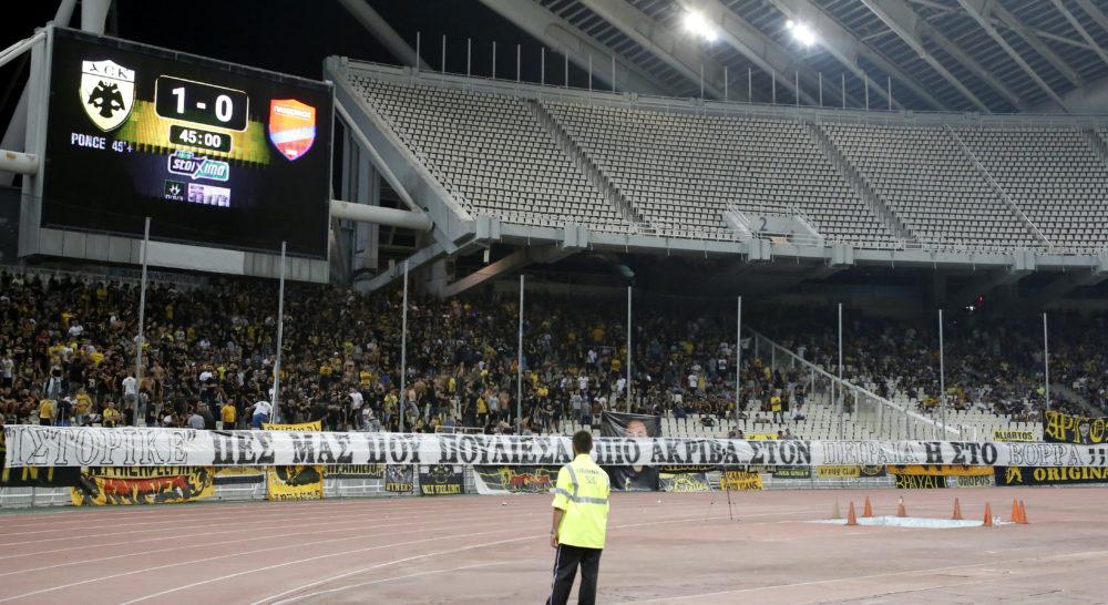 Σχετικά με το προσβλητικό πανό εναντίον του Πανιωνίου, που κρέμασαν οι οπαδοί της ΑΕΚ, «Ιστορικέ πες μας που πουλιέσαι πιο ακριβά, στον Πειραιά ή στον Βορρά», θα πρέπει να παρέμβει ο Αθλητικός Δικαστής.