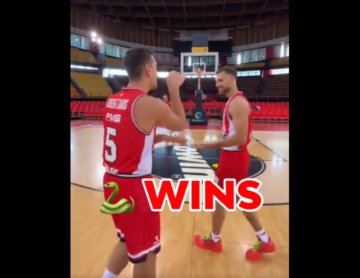 Γιαννούλης Λαρεντζάκης και Τζορτζ Πάπας διαγωνίστηκαν στα τρίποντα στο πλαίσιο του παιχνιδιού «moneyball», με τον πρώτο να είναι ο νικητής και να… επιτίθεται στον συμπαίκτη του με τον αγαπημένο του πανηγυρισμό της κόμπρας.