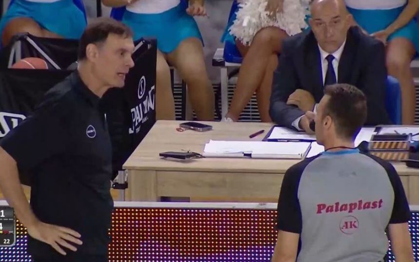 Ο Γιώργος Μπαρτζώκας είχε μια σύντομη στιχομυθία με τον Παπαπέτρου και την υπόλοιπη διαιτητική ομάδα που σφυρίζει τον τελικό του Super Cup ανάμεσα σε Ολυμπιακό και Παναθηναϊκό στο κλειστό της Ρόδου.