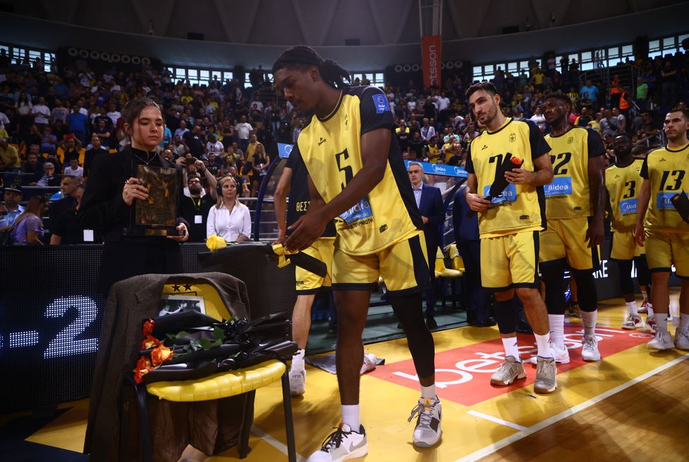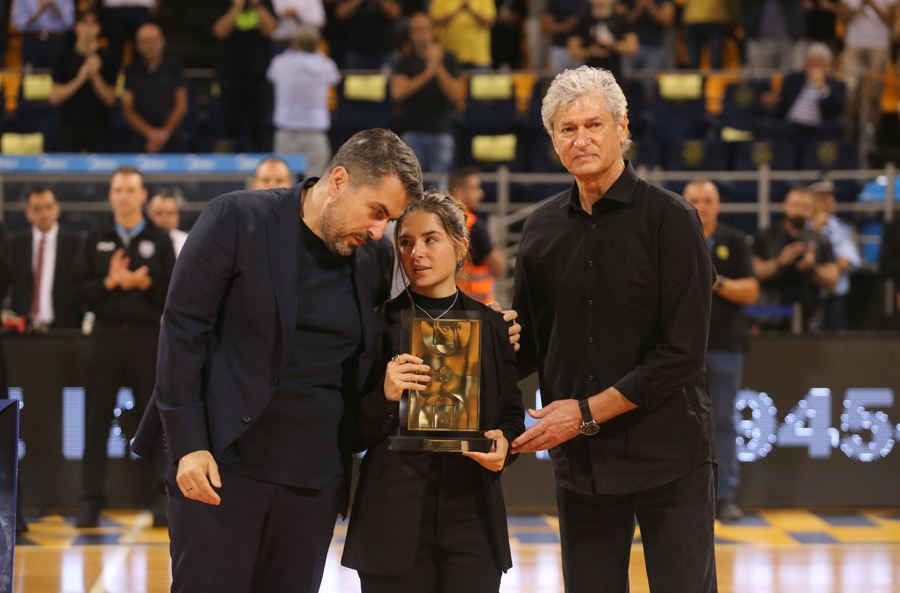 Η κόρη του μάλιστα παρέλαβε βαθύτατα συγκινημένη την τιμητική πλακέτα ενώ οι παίκτες των δύο ομάδων άφησαν από ένα λουλούδι στη μνήμη του. Πριν το τζάμπολ τηρήθηκε ενός λεπτού σιγή, με τις στιγμές να είναι πραγματικά ανατριχιαστικές.