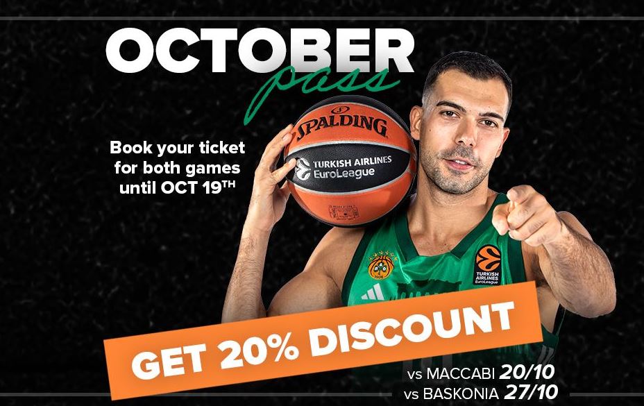 «Η ΚΑΕ Παναθηναϊκός ενημερώνει τους φιλάθλους που είχαν ήδη προμηθευτεί εισιτήριο για έναν από τους δύο εντός έδρας αγώνες της ομάδας μας με την Maccabi Playtika Tel Aviv (20/10) ή την Baskonia Vitoria-Gasteiz (27/10) πριν την κυκλοφορία του October Pass, ότι σε περίπτωση που θελήσουν να αγοράσουν εισιτήριο και για τον έτερο αγώνα της προσφοράς, θα ισχύσει κανονικά η έκπτωση της τάξης του 20% για το σύνολο της τιμής και των δύο αγώνων, αυστηρά μέχρι τις 19/10.