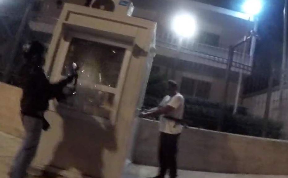 Παράλληλα, έσπασαν τα τζάμια στο κουβούκλιο του σκοπού της πρεσβείας, τον οποίο έβγαλαν έξω. Ο φρουρός βγαίνει έξω με αμφίεση που σαφώς δεν θυμίζει αυτή αστυνομικού. Kρατούσε υποπολυβόλο MP-5 και φορούσε ένα μακό μπλουζάκι, μια εικόνα που εκθέτει την ελληνική αστυνομία, καθώς θα μπορούσαν στη θέση των μελών του Ρουβίκωνα να βρίσκονται τρομοκράτες.