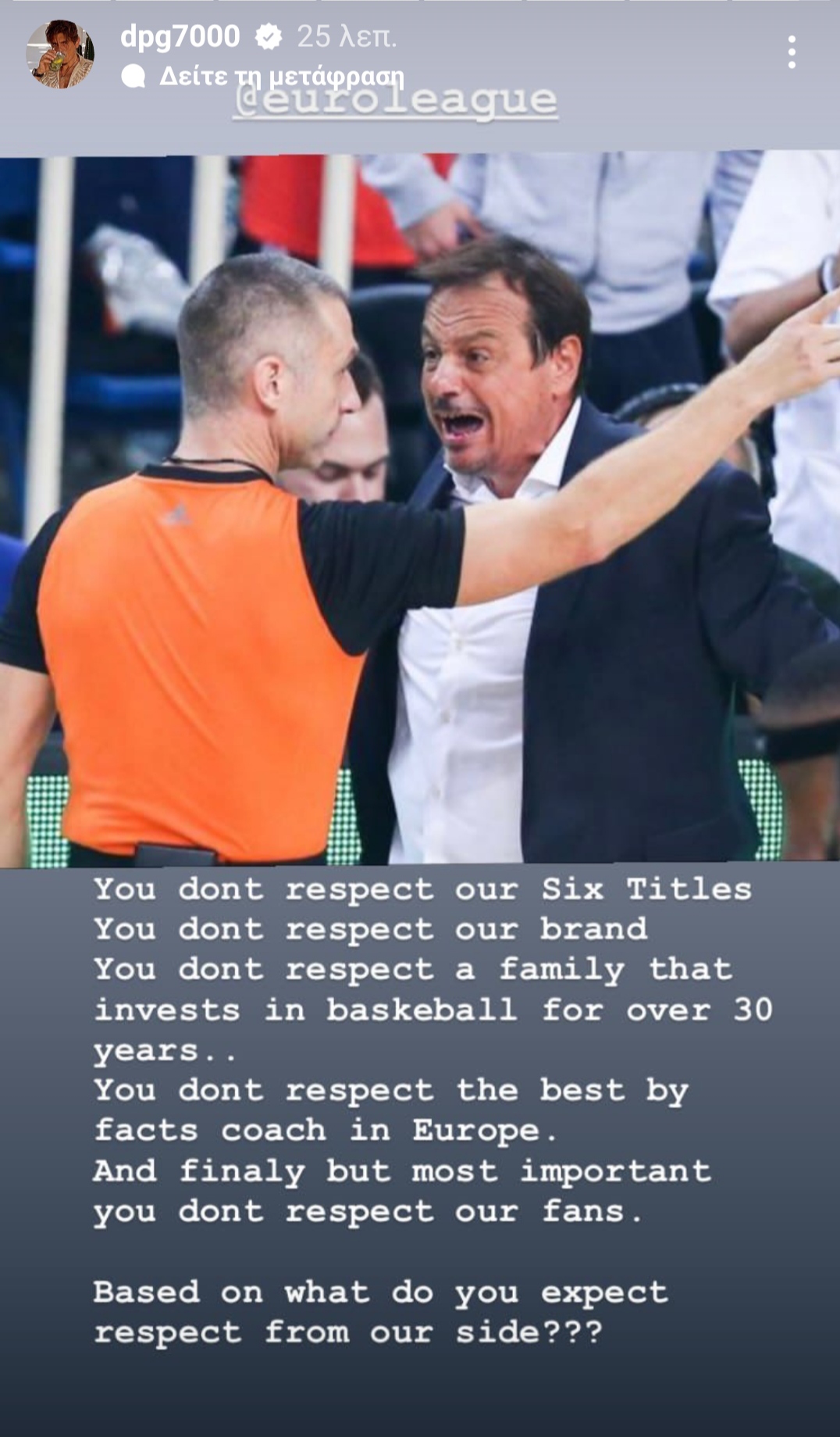 Ξέσπασμα μέσω… Instagram από τον ιδιοκτήτη της ΚΑΕ Παναθηναϊκός, Δημήτρη Γιαννακόπουλο, ο οποίος αντέδρασε με λόγια κατά της Euroleague μέσω του λογαριασμού του λίγο μετά την αποβολή του Εργκίν Αταμάν με δεύτερη τεχνική ποινή από τον αγώνα του Παναθηναϊκού με τη Μακάμπι.