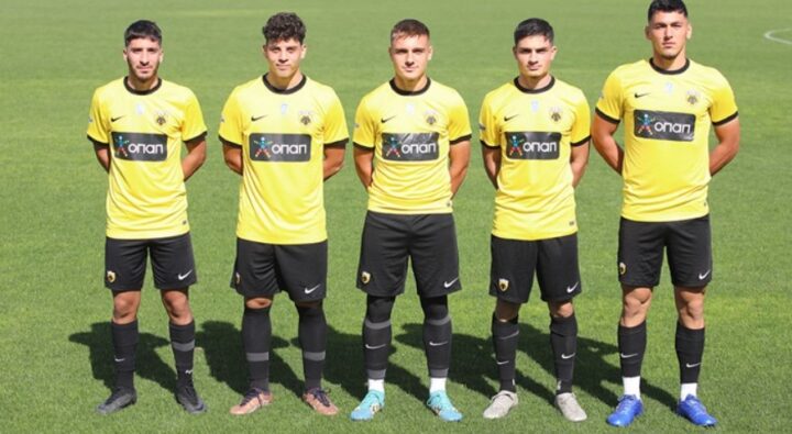«Επαγγελματικά συμβόλαια υπέγραψαν οι ποδοσφαιριστές (από τα αριστερά προς τα δεξιά στη φωτογραφία) Τάσος Κοντορουχάς, Αντώνης Γεωργέας, Αρης Ανδρικόπουλος, Χρήστος Γιαννούλης και Χρήστος Κοσίδης που προέρχονται από την Ακαδημία της ΠΑΕ.