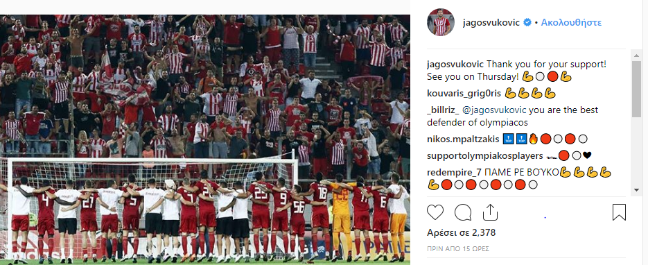 Ο Γιάγκος Βούκοβιτς έστειλε το δικό του μήνυμα στους φιλάθλους του Ολυμπιακού, καθώς με ανάρτηση που δημοσίευσε στον προσωπικό του λογαριασμό στο twitter, ευχαρίστησε τους «ερυθρόλευκους» οπαδούς για την στήριξή τους προς την ομάδα με τον Αστέρα Τρίπολης στο Καραΐσκάκη.
