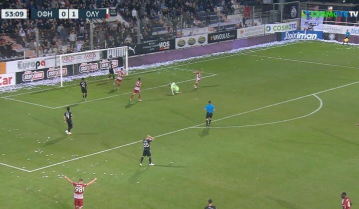 Οι Ερυθρόλευκοι πίεσαν ψηλά, ο Γιόβετιτς έκλεψε την μπάλα και έδωσε έτοιμο γκολ στον Πορτογάλο που πλάσαρε σε κενή εστία για το 0-2 στο 54′.