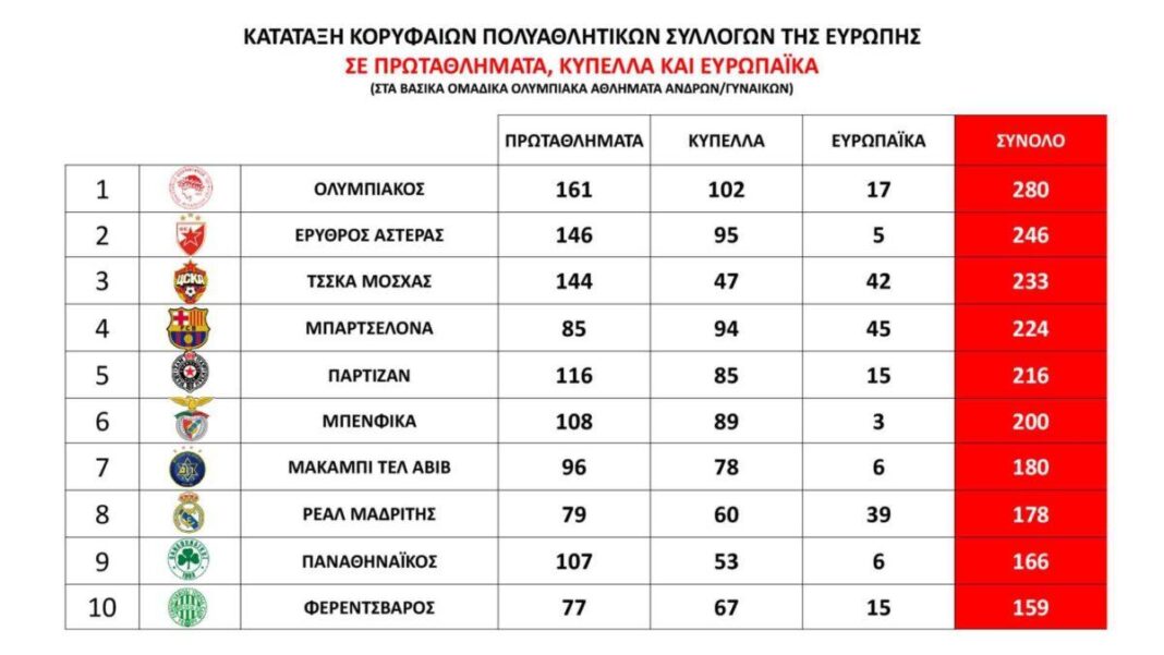Στον επόμενο πίνακα είναι τα εθνικά Κύπελλα, ο Ολυμπιακός είναι πάλι πρώτος, με 102, έναντι 95 του Ερυθρού Αστέρα. Προχωράμε με έναν πολύ σημαντικό πίνακα, που μας κάνει πραγματικά υπερήφανους, γιατί αυτός είναι ο στόχος μας, η Ευρώπη. Ο Ολυμπιακός είναι στην πέμπτη θέση με 17 ευρωπαϊκά, σε πέντε τμήματα! Είναι αυτό που μας καθορίζει, αυτό που σκεφτόμασταν πάντα, τον Ολυμπιακό στην Ευρώπη.