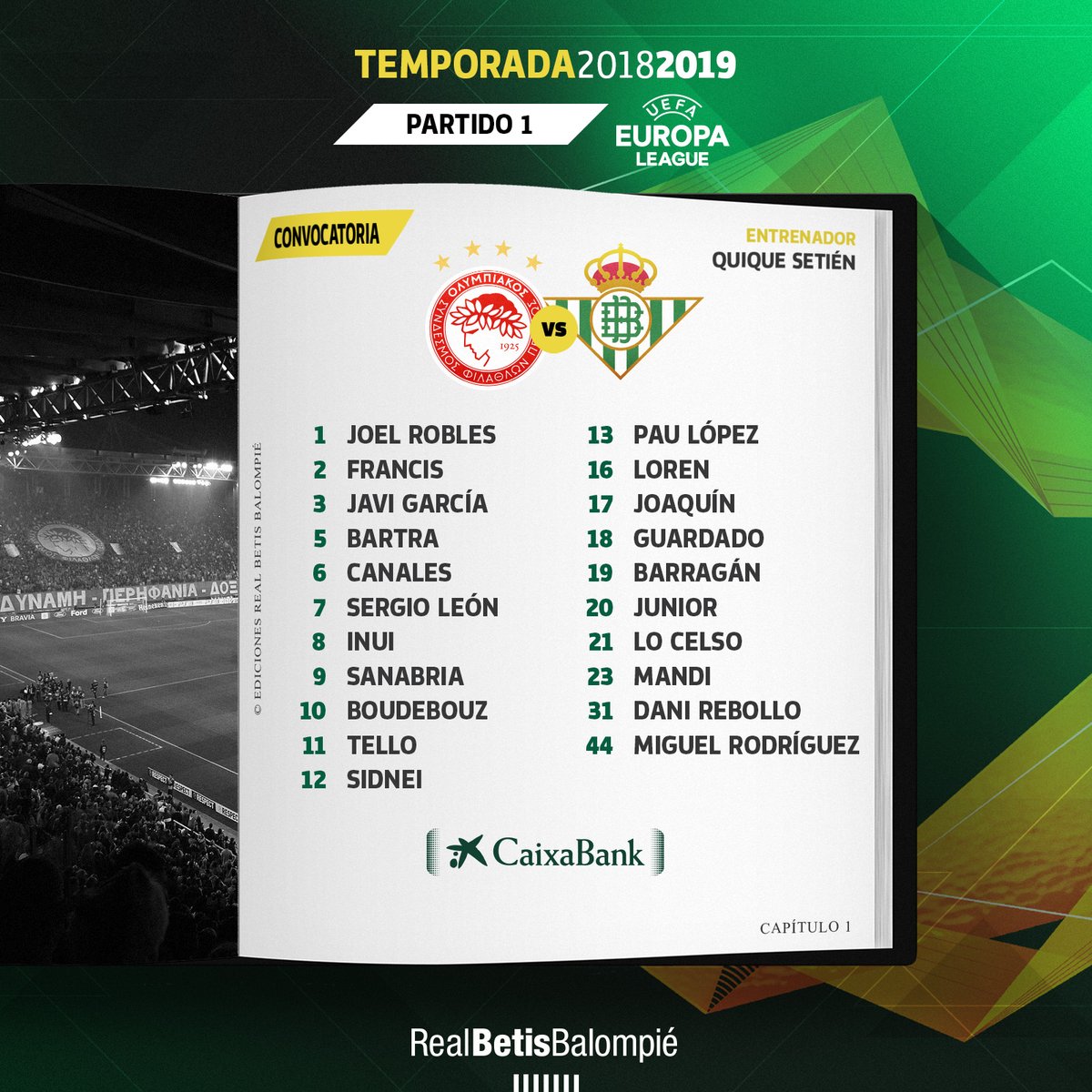 Η Μπέτις ανακοίνωσε την αποστολή που θα έρθει στην Ελλάδα ενόψει της μεθαυριανής αναμέτρησης με τον Ολυμπιακό στο Γεώργιος Καραϊσκάκης, στην πρεμιέρα των ομίλων του Γιουρόπα Λιγκ. Ο Κίκε Σετιέν απέκλεισε, όπως είχε προαναγγείλει, τον Γιούλιαμ Καρβάλιο που δεν είναι ακόμα ανέτοιμος μετά τον τραυματισμό του.