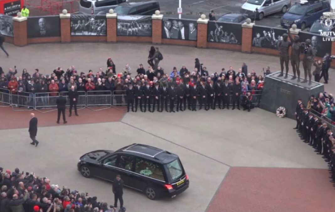 Σταμάτησε στο άγαλμα της «Αγίας Τριάδας», -Μπόμπι Τσάρλτον, Τζορτζ Μπεστ και Ντένις Λο-, καθώς οι ομάδες U18 και U21 της Μάντσεστερ Γιουνάιτεντ σχημάτισαν τιμητική φρουρά για να αποτίσουν φόρο τιμής, ενώ εκατοντάδες μπουκέτα και κασκόλ περιβάλλουν τη βάση του αγάλματος