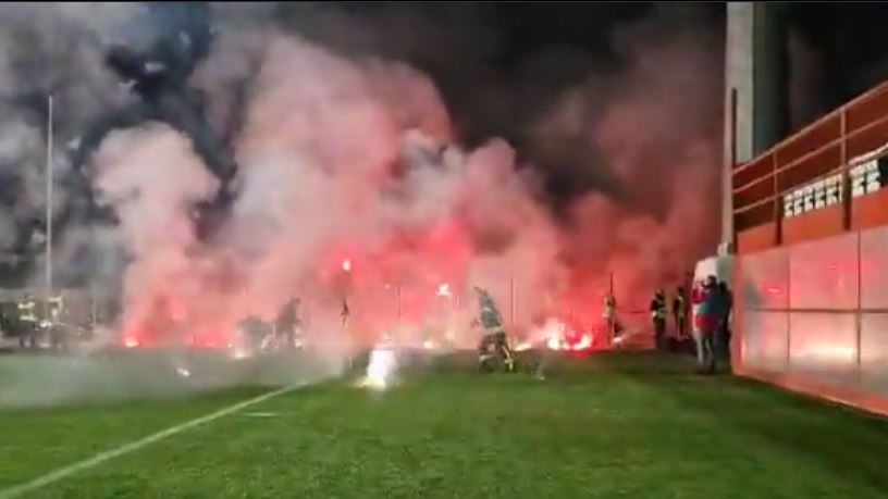 Οπαδοί των φιλοξενούμενων ήρθαν σε σύγκρουση με την Αστυνομία αφού πρώτα πέταξαν φωτοβολίδες με αποτέλεσμα η αναμέτρηση να διακοπεί πριν καν συμπληρωθεί το ημίωρο με μεγάλη ένταση και σκηνικό χάους.