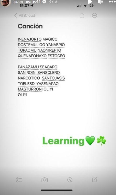 Ο Ισπανός πέρα από την αποθεραπεία του φαίνεται πως ασχολείται και με τα συνθήματα των οπαδών του Παναθηναϊκού, καθώς δημοσίευσε στο Instagram μία φωτογραφία με ένα γνωστό σύνθημα του τριφυλλιού το οποίο προσπαθεί να αποστηθίσει, καθώς φαίνεται το ξεχώρισε στους έντονους πανηγυρισμούς μετά τη νίκη επί της Βαλένθια.
