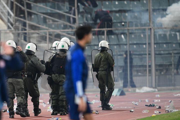 Αργότερα, μεγαλύτερη ομάδα εκατοντάδων ατόμων, έξω από το γήπεδο, κινήθηκε απειλητικά κατά αστυνομικών -εκσφενδονίζοντας αντικείμενα (πέτρες και φωτοβολίδες ευθείας βολής)- με αποτέλεσμα να απειληθεί η σωματική ακεραιότητα των οργάνων της τάξης και να προκληθούν ζημιές σε δύο υπηρεσιακά λεωφορεία της ΕΛ.ΑΣ.