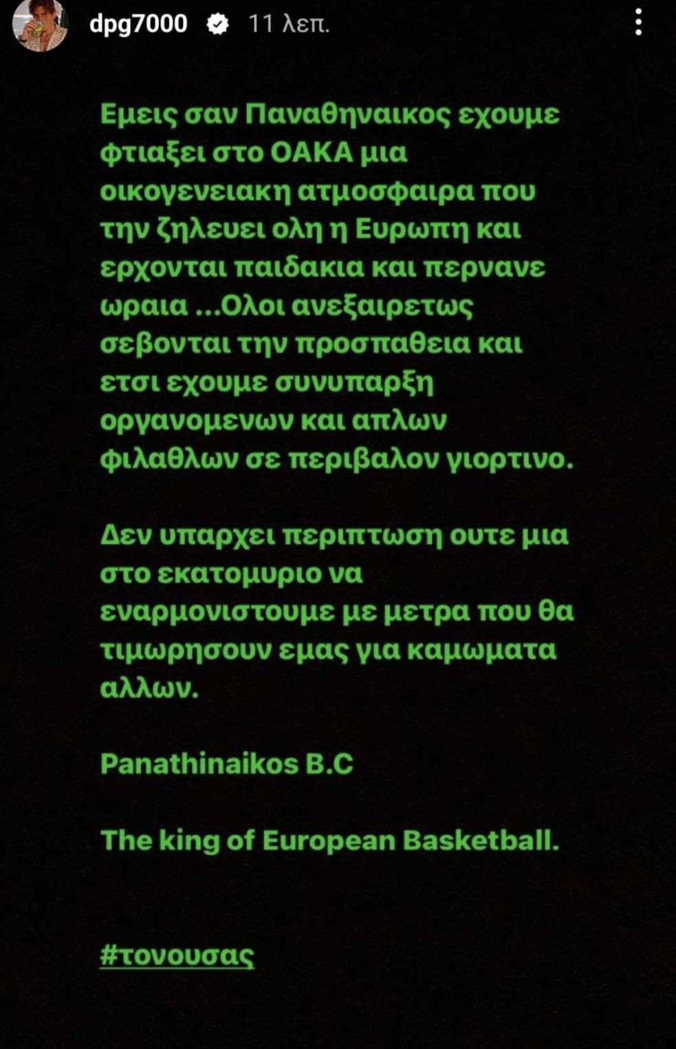 «Εμείς σαν Παναθηναϊκός έχουμε φτιάξει στο ΟΑΚΑ μια οικογενειακή ατμόσφαιρα που τη ζηλεύει όλη η Ευρώπη και έρχονται παιδάκια και περνάνε ωραία. Όλοι ανεξαιρέτως σέβονται την προσπάθεια και έτσι έχουμε συνύπαρξη οργανωμένων και απλών φιλάθλων σε περιβάλλον γιορτινό. Δεν υπάρχει περίπτωση ούτε μία στο εκατομμύριο να εναρμονιστούμε με μέτρα που θα τιμωρήσουν εμάς για καμώματα άλλων», ανέφερε στον λογαριασμό του στο instagram (dpg7000).
