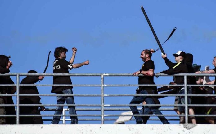 Then face-to-face battles raged on for more than half an hour across a bridge connecting the two sides of the stands where the opposing fans met, leaving several dozens injured. The police was unable (or unwilling) to intervene and it was a miracle there were no fatalities at that spot, as anyone thrown off that bridge would have died.